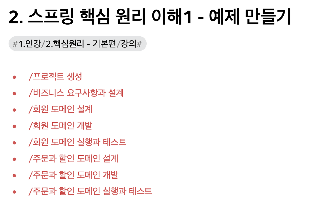 그리고 예제가 어느 정도는 복잡도가 있어야 되기 때문에 회원 도메인, 주문, 할인 같은 도메인들을 넣어가지고, 물론 예제의 핵심에 집중해야 되니까 굉장히 간단하게 할 거에요. 이 도메인들을 섞어서 예제를 하나 만들어 볼 겁니다. 그리고 역할과 구현을 나누고, 이걸 스프링의 도움 없이 순수한 자바로만 개발을 해볼 거에요.