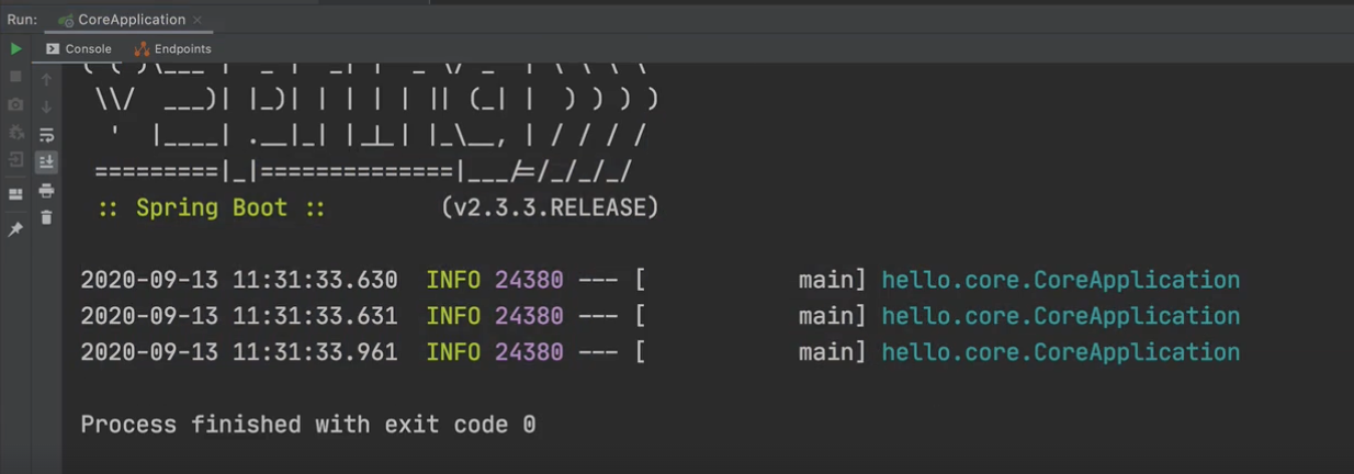 이렇게 되고 끝이 나야합니다. 지금 웹 서버를 띄우고, 스프링 웹 프로젝트를 넣은 게 아니기 때문에 그냥 이렇게 실행하고 끝나버리는 게 맞습니다.