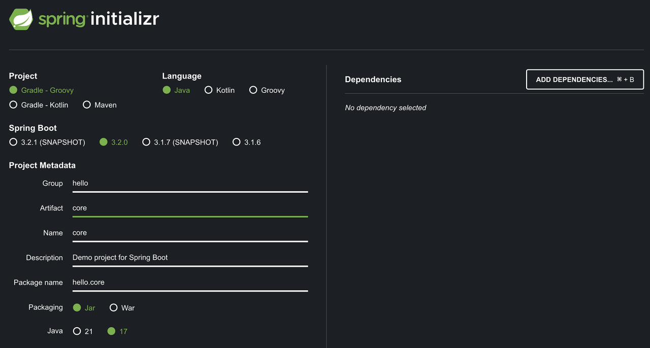 스프링 부트 버전이 3.2.0 이고, 의존관계가 설정되어 있습니다.