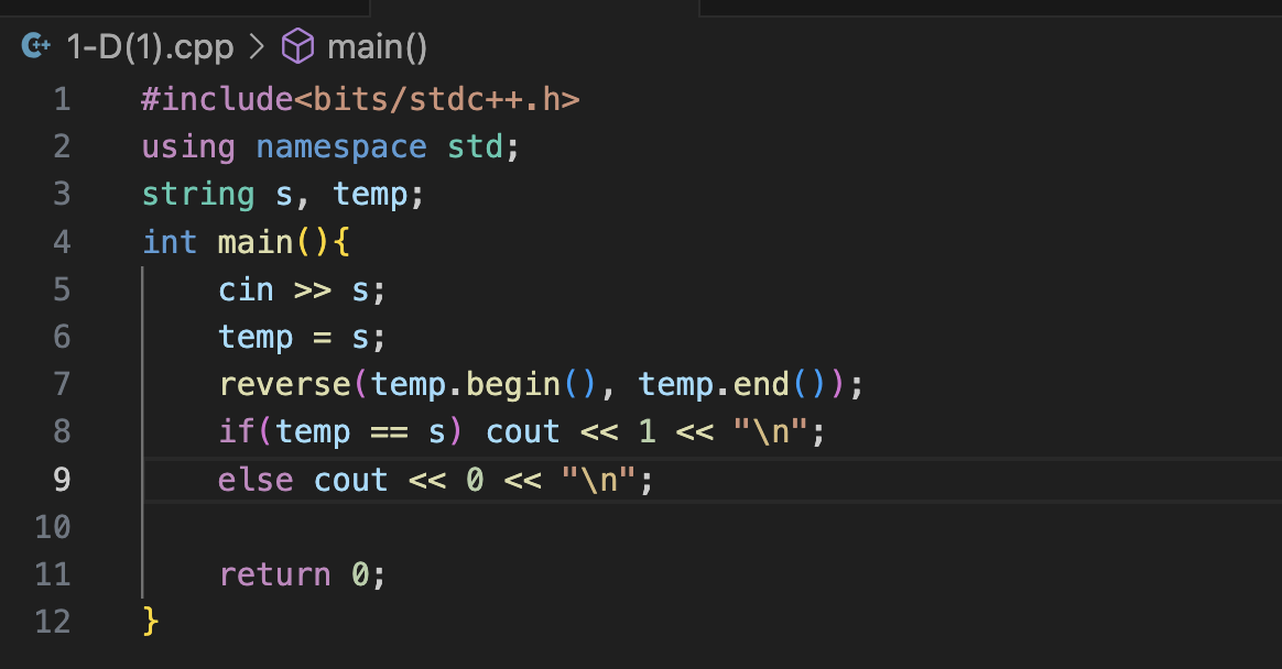 그래서 temp 라는 걸 대신 뒤집어요. 뒤집어서 원본 배열과 같은지를 확인해서 같으면 1, 다르면 0 이런 식으로 출력을 하면 되는 겁니다.