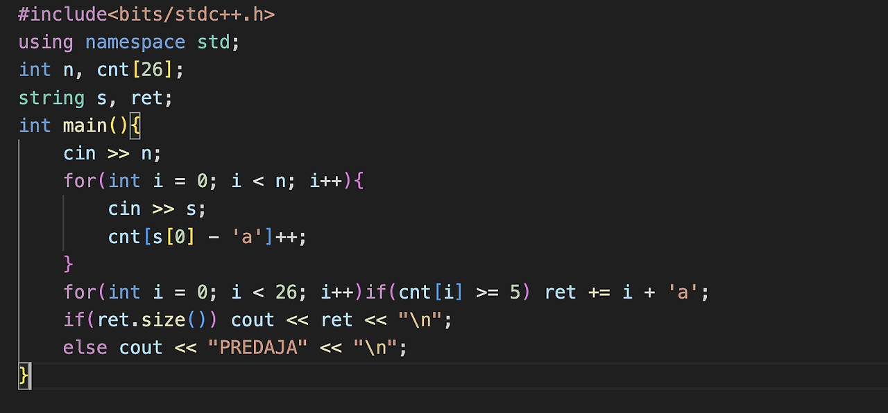 이 문제는 어떤 주어진 문자열을 기반으로 해서 문자열의 첫 글자가 같은 게 5개 이상이면 그 문자들을 모아서 오른차순으로 출력을 하고, 그게 아니면 "PREDAJA" 라는 특정 문자열을 출력하면 되는 문제죠.