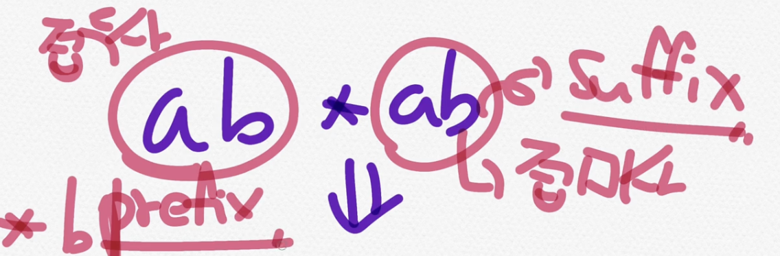 왜냐면 추출한 문자열의 길이 만큼 검사를 하는 건데, 접두사 접미사 둘 다 2만큼 검사할 거고, ab는 길이가 2니까 맞다고 나오겠죠.