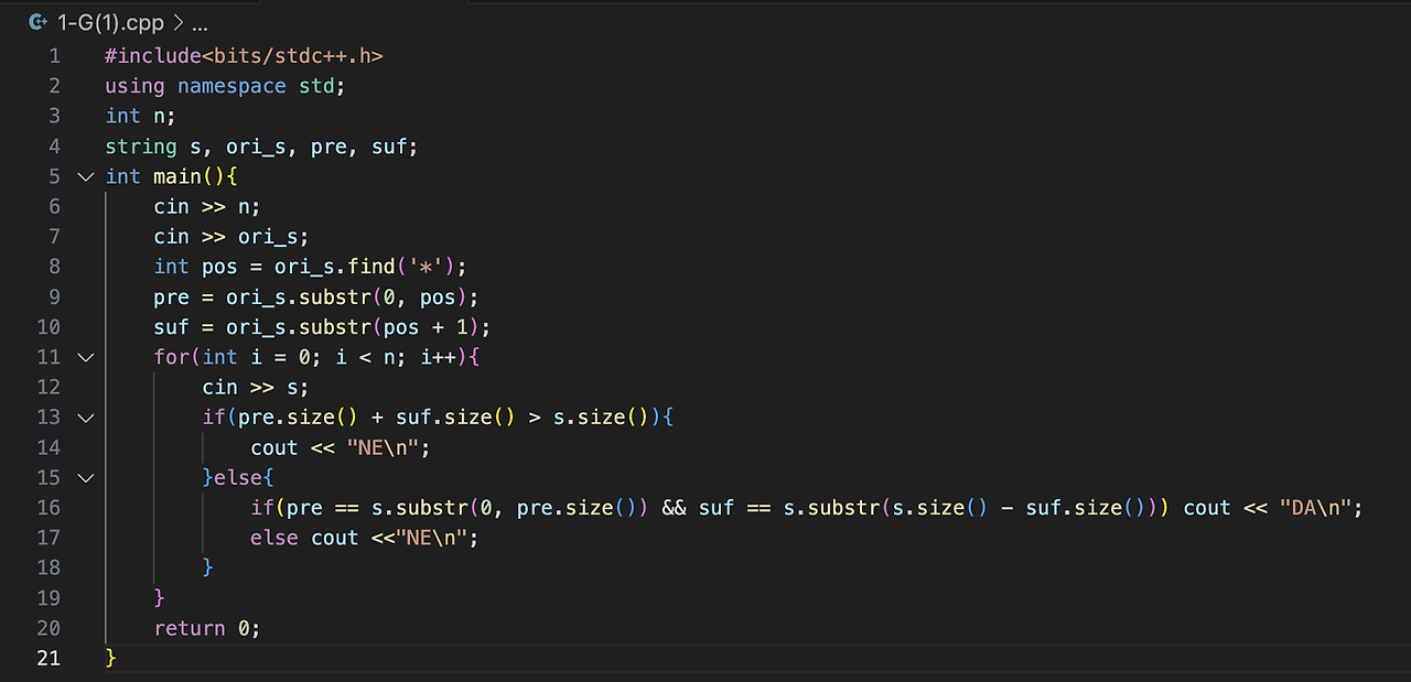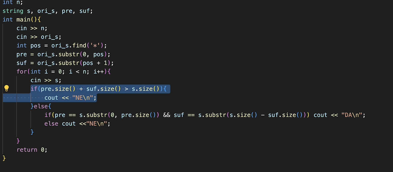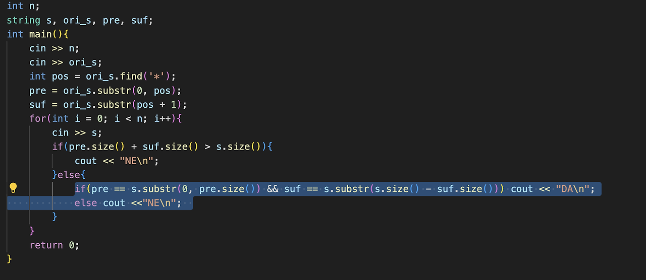 이 문제에서 이 와일드카드(wildcard), 그러니까 에스터리스크를 기반으로 해서 이 앞과 뒤가 무조건 한 글자라고 명시가 되어 있나요? 아니죠.