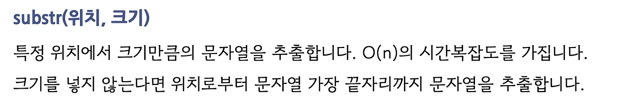 substr은 특정 위치에서 크기만큼의 문자열을 추출합니다. 그리고 크기를 넣지 않는다면 위치로부터 문자열 가장 끝자리까지 문자열을 추출해요.