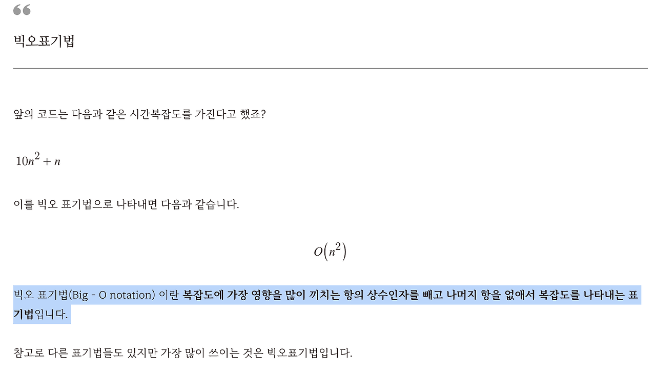 다시 빅오 표기법은 복잡도에 가장 영향을 많이 끼치는 항의 상수인자를 빼고 나머지 항을 없애서 복잡도를 나타내는 표기법 입니다.