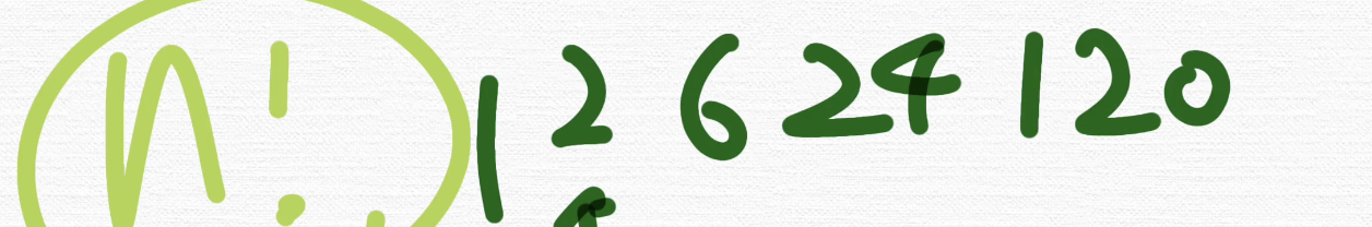 먼저, n!는 자신을 포함해서 그 전까지를 곱하는 거에요. 자 n = 1부터 해서 5까지 해보면,