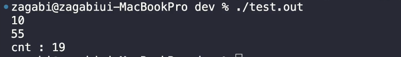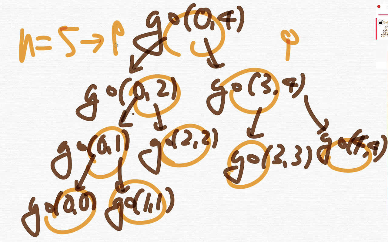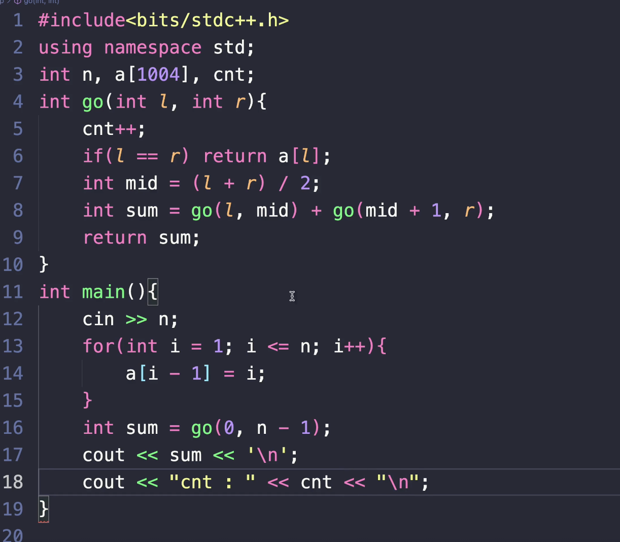 이렇게 나옵니다. 로직 자체는 단순한 로직이에요. go란 함수를 mid를 기반으로 둘로 나눠요. 그러고 sum을 구하는 문제인데 이 함수가 몇 번 호출 됐냐, n이 10일 때 cnt가 19가 나와요.