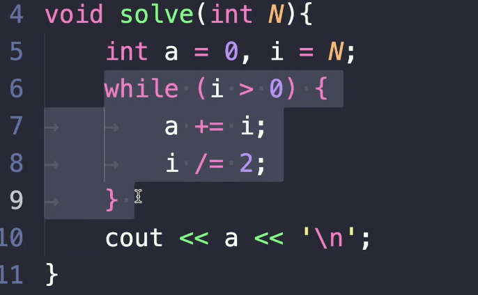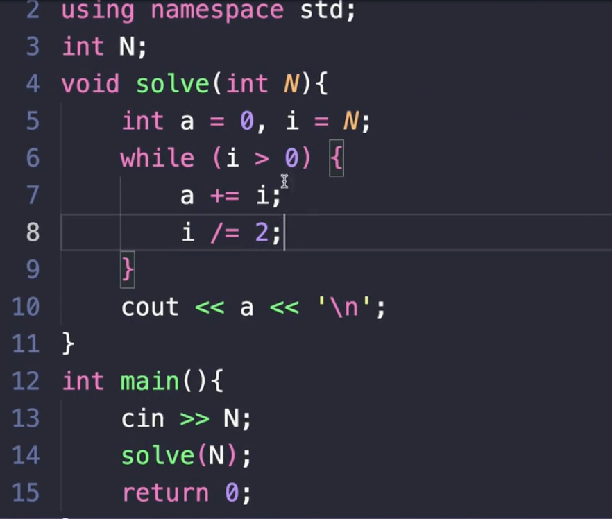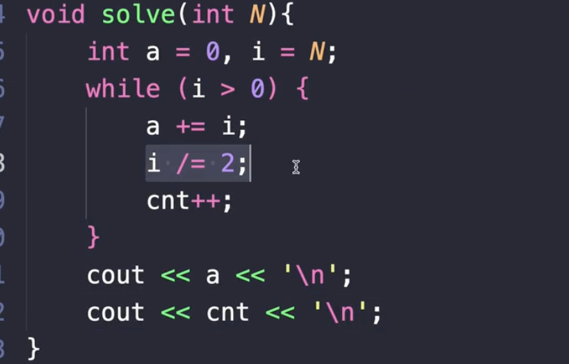 이 코드를 봤을 때, i를 계속해서 2로 나누니까 이 알고리즘에 들어가는 횟수가 log2(n)이라는 것을 알 수가 있었죠.
