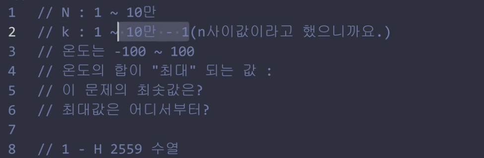 그래서 이 문제는 연속된 온도의 합이 연속된 온도의 합이 최대가 되는 값을 구하라라는 건데, 여러분 어떤 생각이 나요?