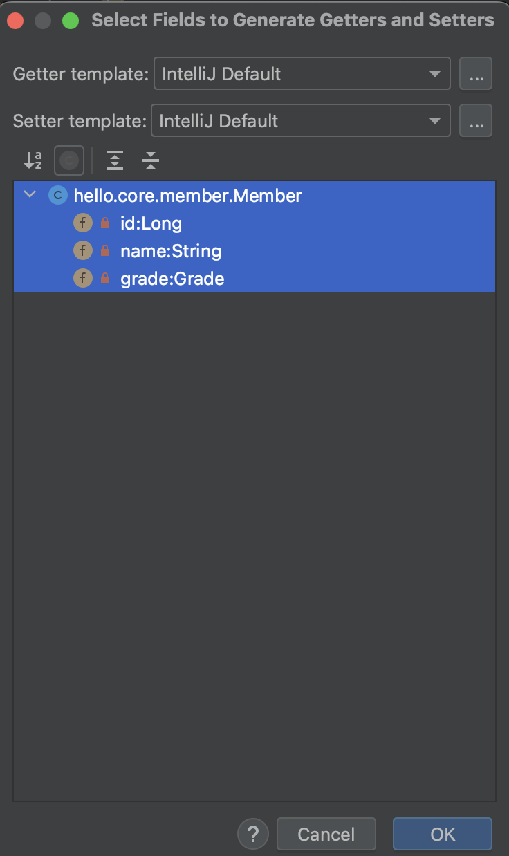 이렇게 됩니다. 그 다음에 Getter, Setter 를 만들어 줄 거에요. 역시 cmd + N 해서 Getter and Setter를 검색하시면 됩니다.