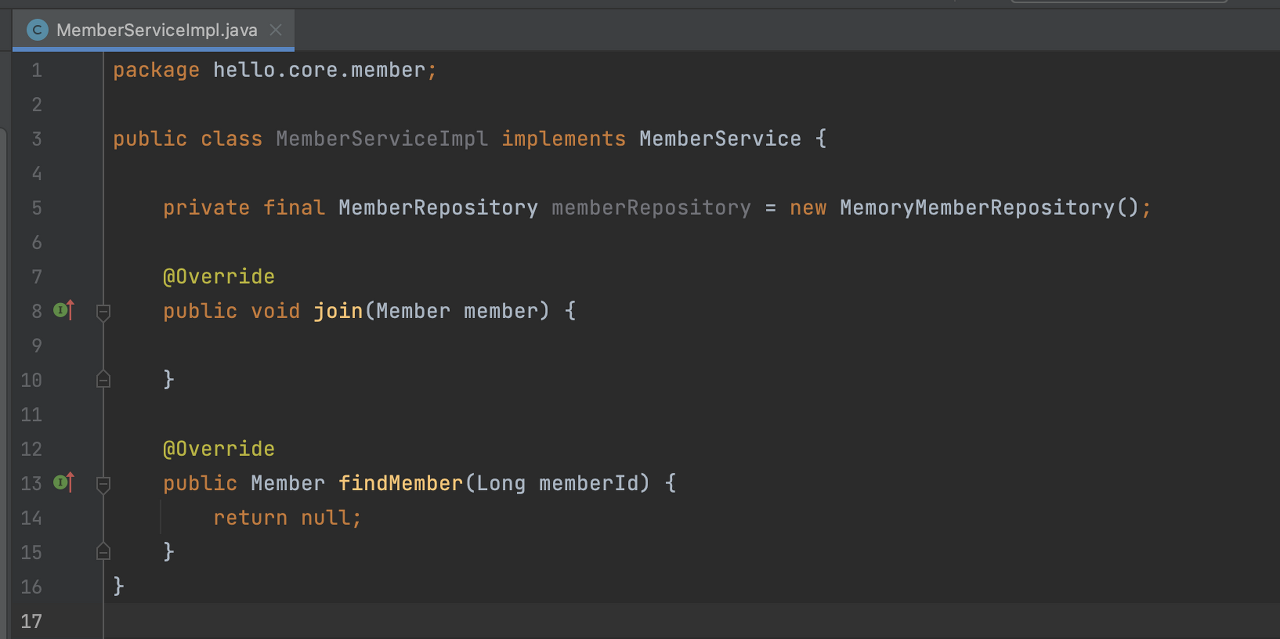 MemberServiceImpl 이라고 뒤에 Impl 을 붙이는 거는 관례 같은 건데요, 구현체 하나만 있을 때는 그냥 그 인터페이스명 뒤에 Impl 이라고 관례상 많이 씁니다.