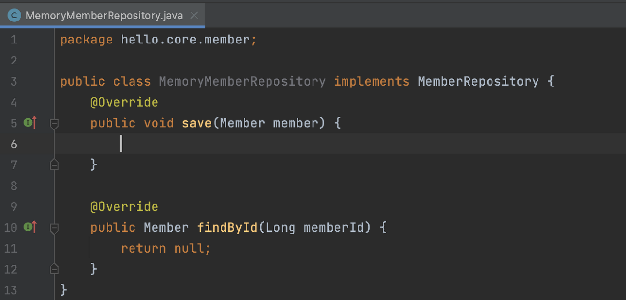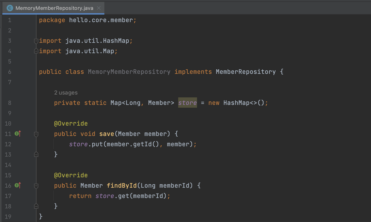 그리고 이러한 회원 저장소(MemberRepository)를 만들었으니까 이제 구현체를 만들어야 되겠죠. 인터페이스만 가지고는 동작하지 않으니까요.