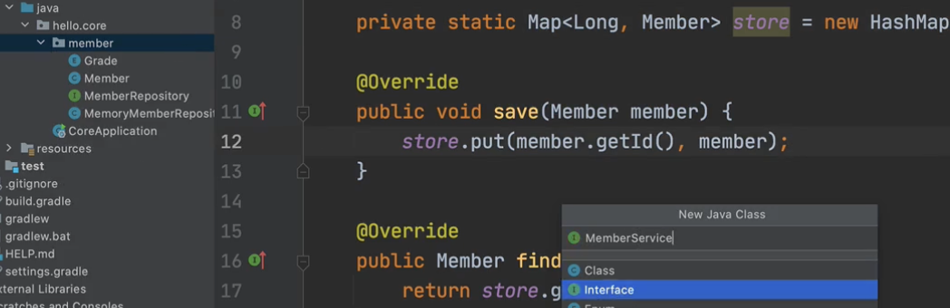 MemoryMemberRepository를 만들고, 그 다음에 인터페이스를 implements 해서 MemberRepository를 구현하겠다고 하면 됩니다.