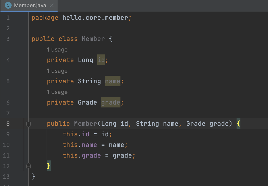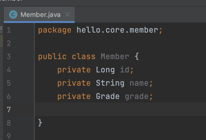 hello 패키지 안의 core 패키지 안의 member 패키지 안에다가 만든 겁니다.