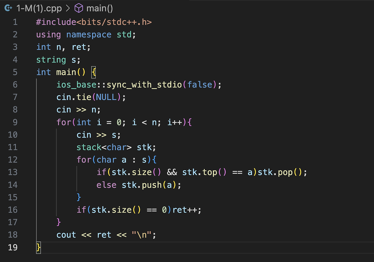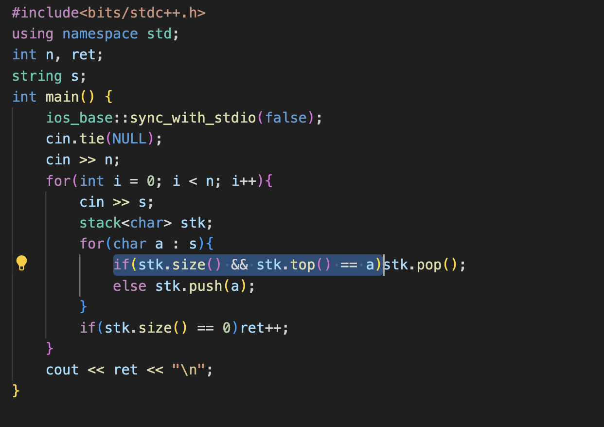 그리고 모든 문자를 다 끝낸 다음에 stack의 size가 0이면, ret++;을 해서 좋은 단어의 개수를 세는 겁니다.