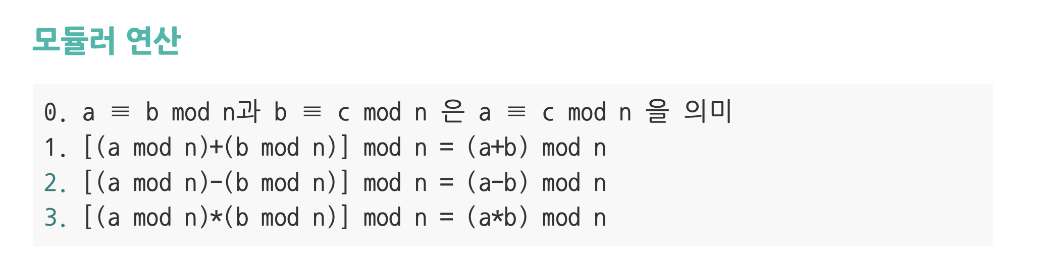 그러면 이 문제는 사실은 또 하나의 개념이 들어가요. 이거는 모듈러 연산에 관한 건데 이거는 교안에 설명이 되어 있습니다.