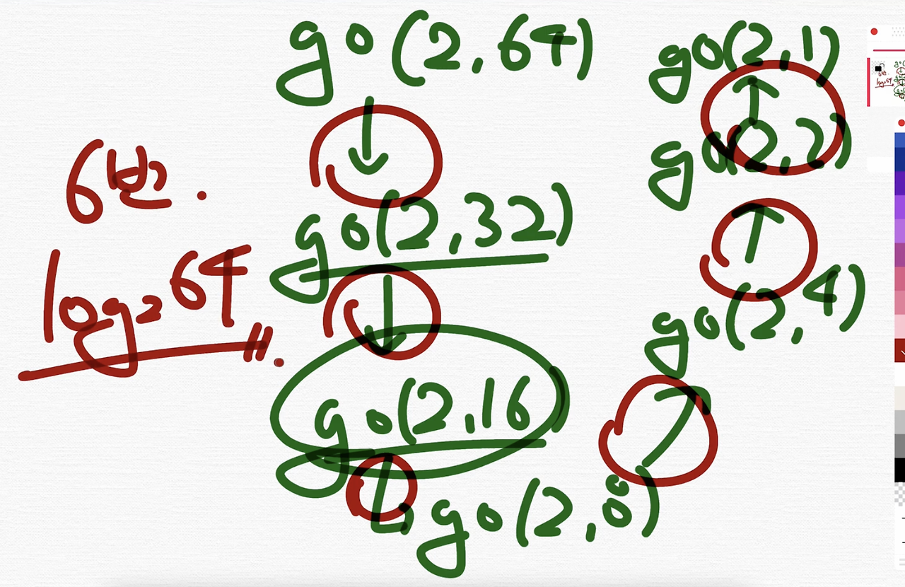 지금 보면 이게 몇 번 일어났어요? 총 6번 일어났어요. 즉 log2의 64번이 되어버린거죠.