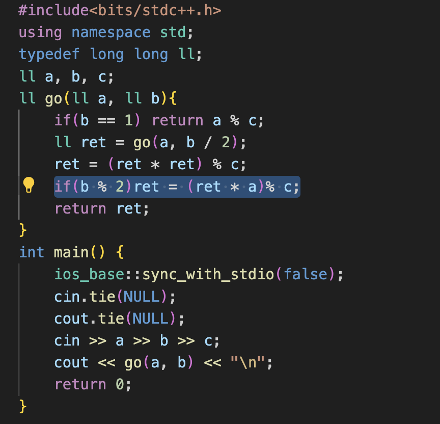 이게 실행되는 거죠. 그리고 (ret * (a % c)) % c 가 아닌 이유는 아래와 같습니다.