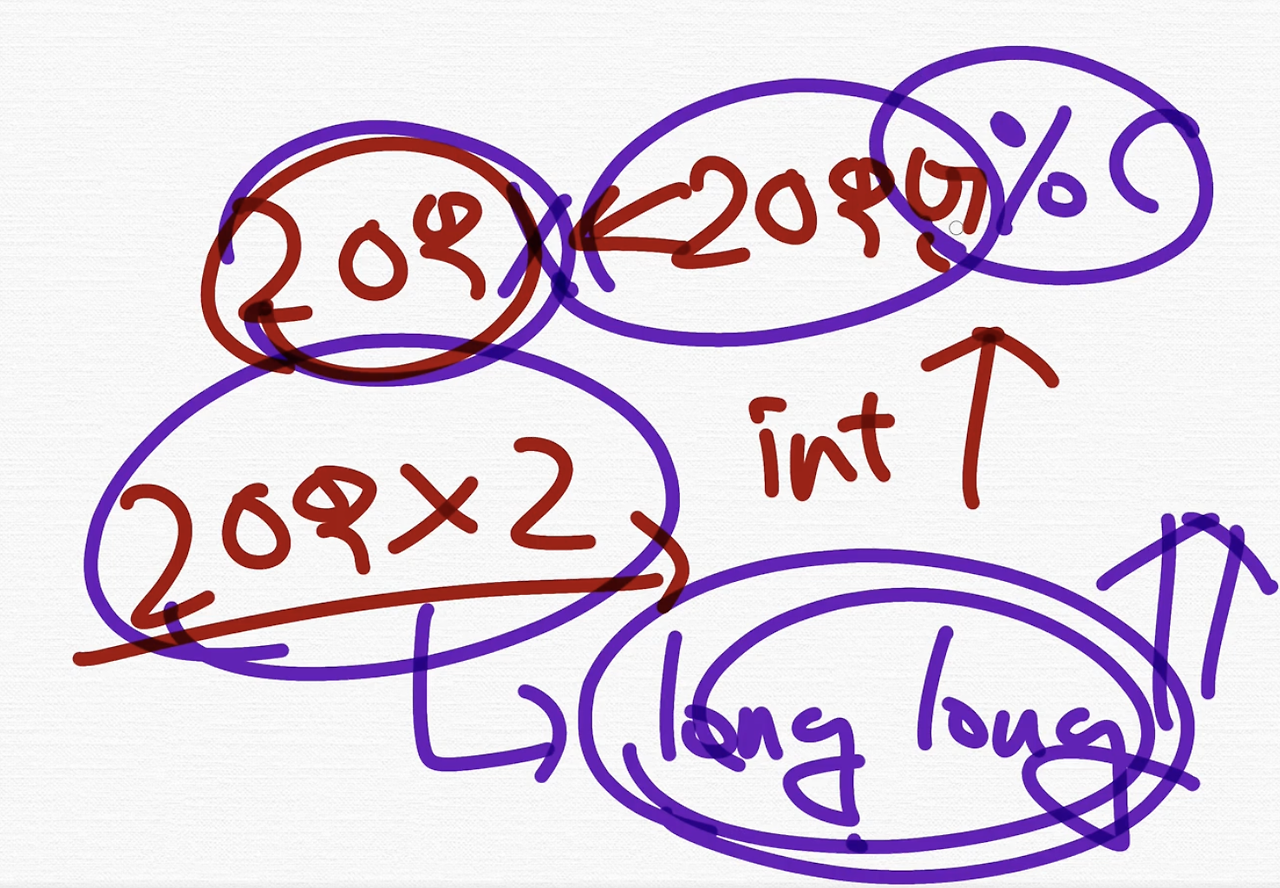그러니까 이 곱하는 것 자체 때문에 일단 범위는 무조건 long long을 써야 돼요. 그런데 20억을 20억번 곱하는데 long long을 당연히 벗어날 거 아니에요. long long으로도 부족하죠.