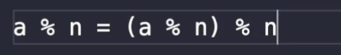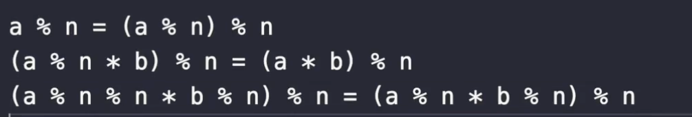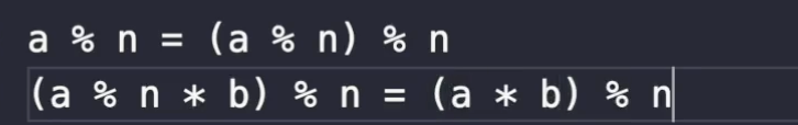 그래서 (a % n * b) % n == (a * b) % n 임을 알 수 있습니다.