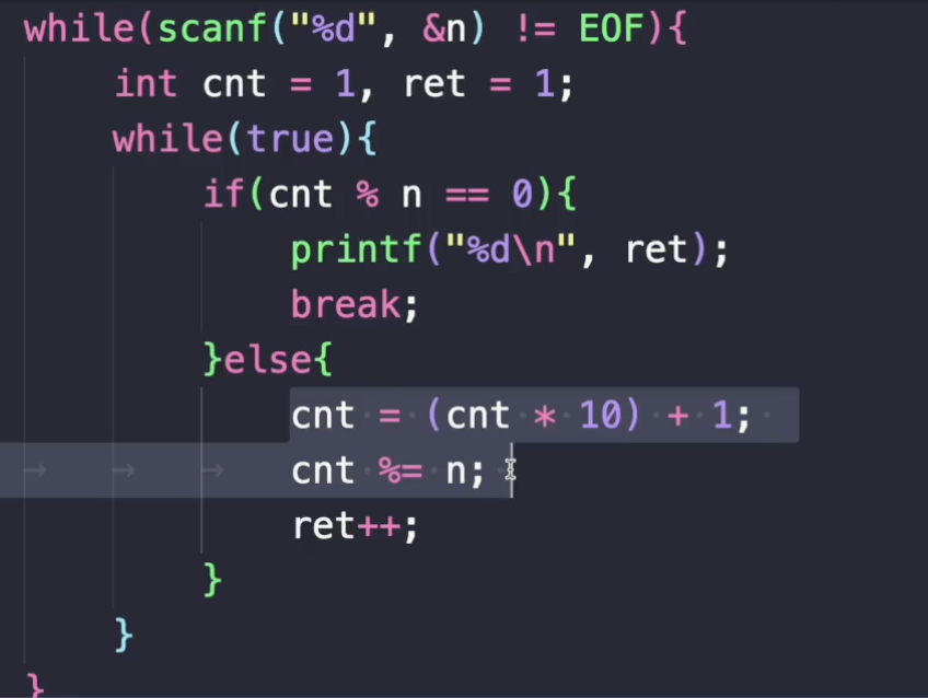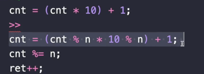 cnt = cnt x 10 + 1; 을 해주고 난 다음 모듈러 연산 n을 해주고 있죠. 그런데 이걸 보고 질문해주시는 분들이 있어요.