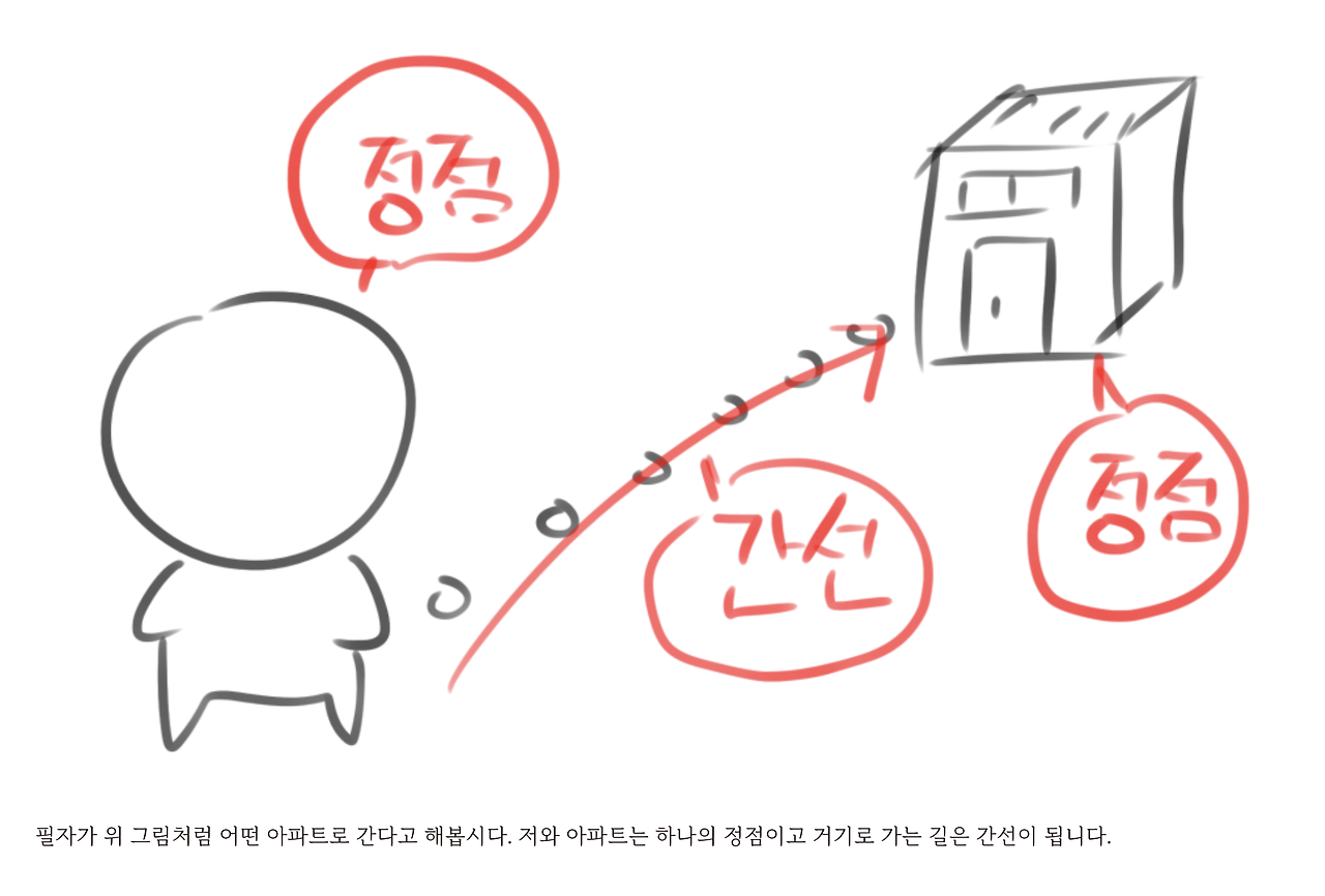관계, 경로 등이 될 수 있어요. 예를 들어서 어떠한 위치나 사람으로부터 무언가를 통해 간다고 했을 때 '어떠한 위치나 사람'은 정점이 되고요. '무언가를 통해 간다'는 간선이 된다라는 거예요.