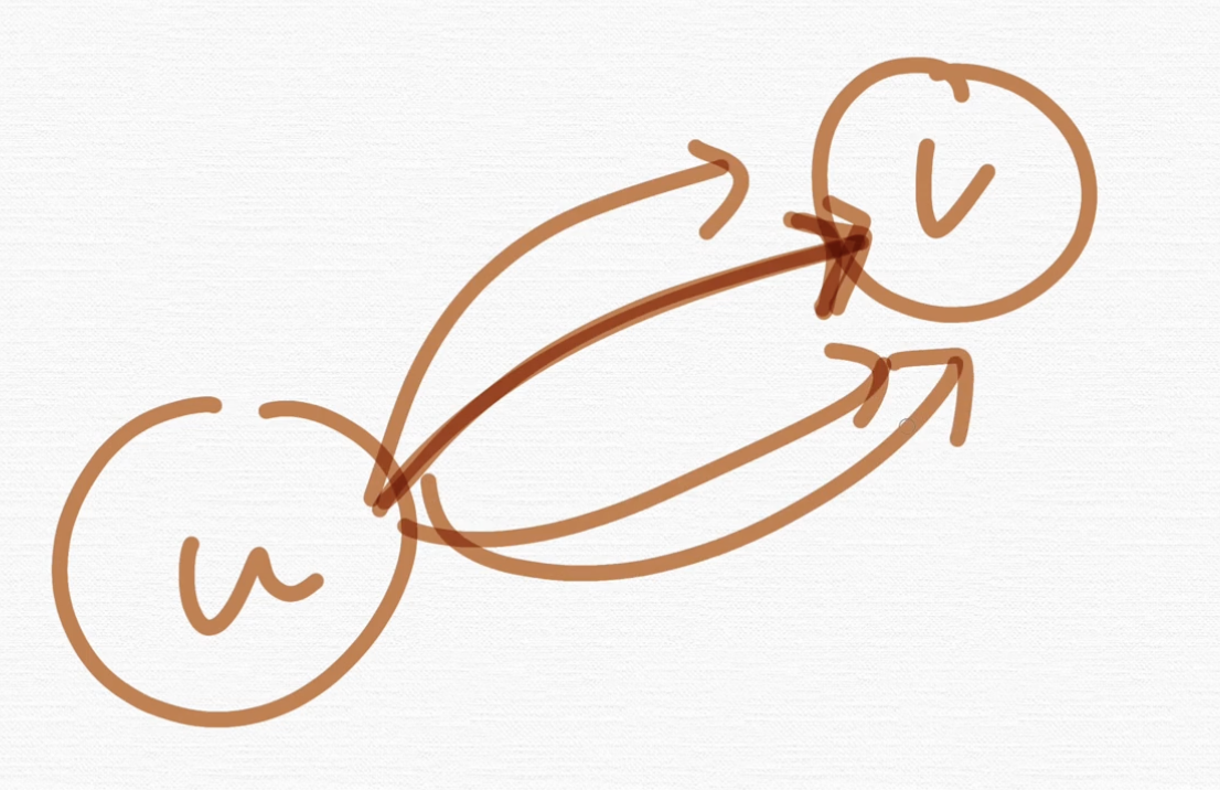 지금 저는 u에서 v로 가는 단방향 간선 하나를 그렸어요. 그런데 u에서 v로 가는 경로가 한 4가지가 있다고 할게요.