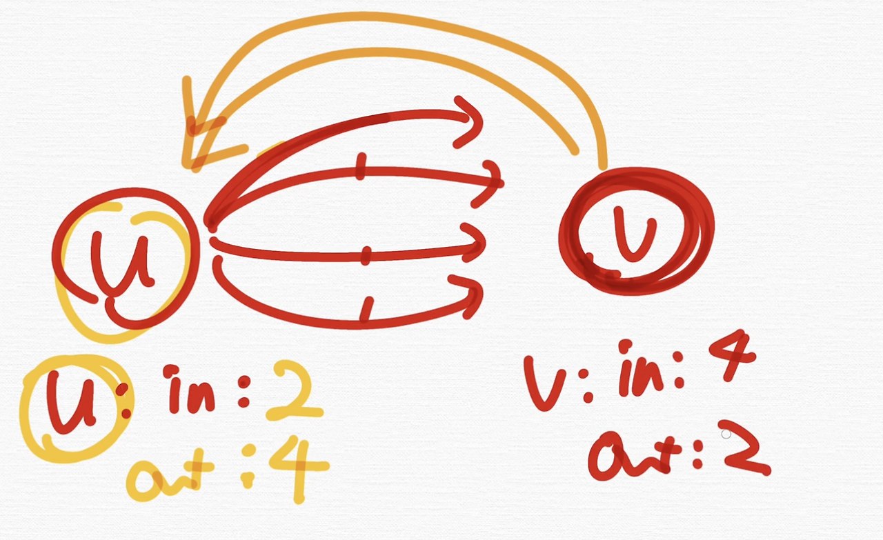 'u의 outdegree가 4개구나' 라고 하는 거예요. 그러니까 정점과 정점을 잇는 간선이 무조건 하나가 아니라는 거예요.