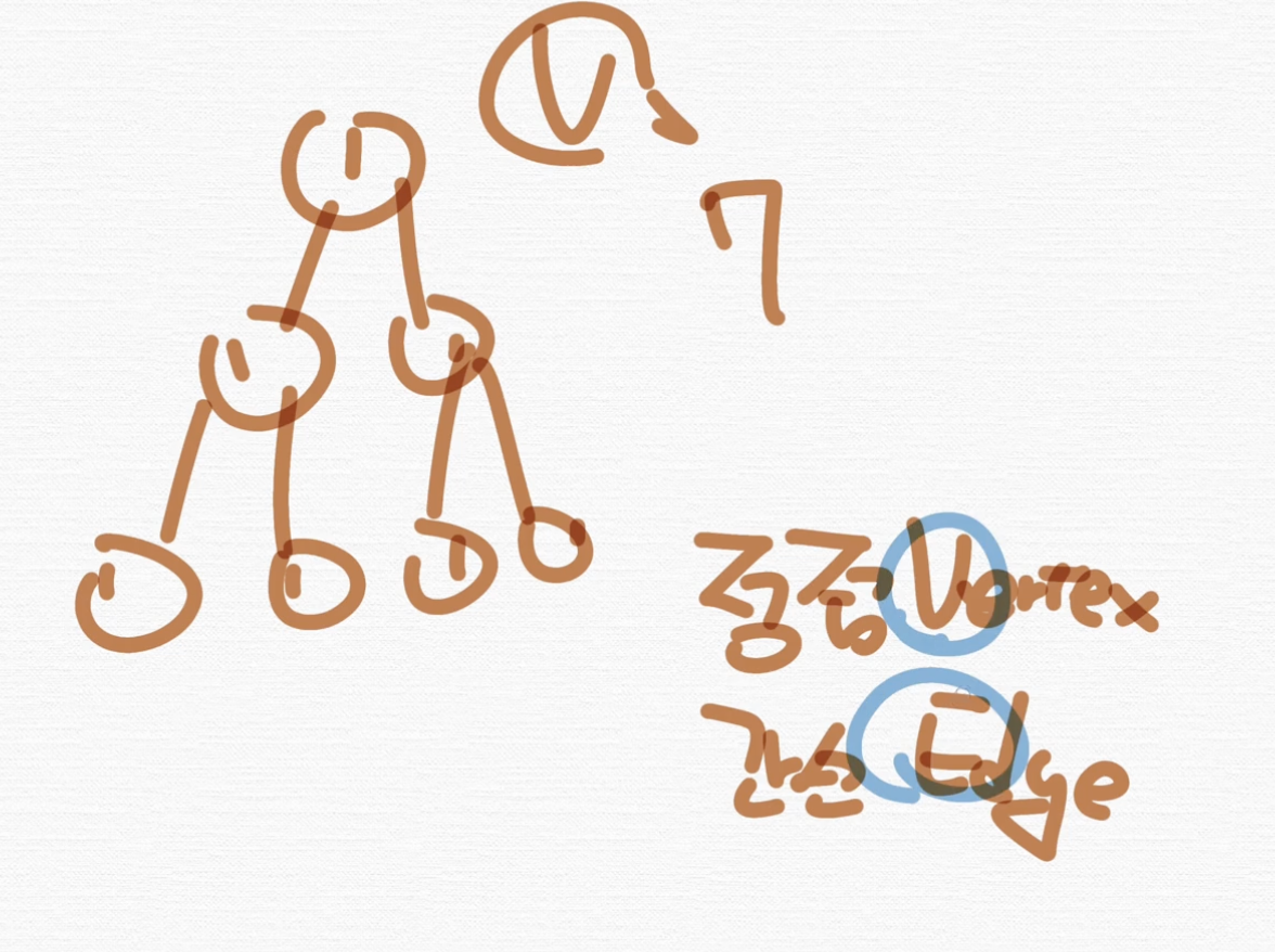 정점(vertex)는 7개죠. 영어 표현은 외워둡시다. 정점은 vertex, 간선은 Edge이고 이걸 축약적으로 V, E 라고 합니다.