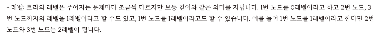 레벨은 사실은 깊이랑 좀 같은 의미인데 사실 이게 문제마다 좀 달라요. 어떤 문제는 1번 노드를 0레벨로 하는 경우도 있고요. 어떤 문제는 0레벨이 아니라, 레벨 1로 하는 경우가 있어요.