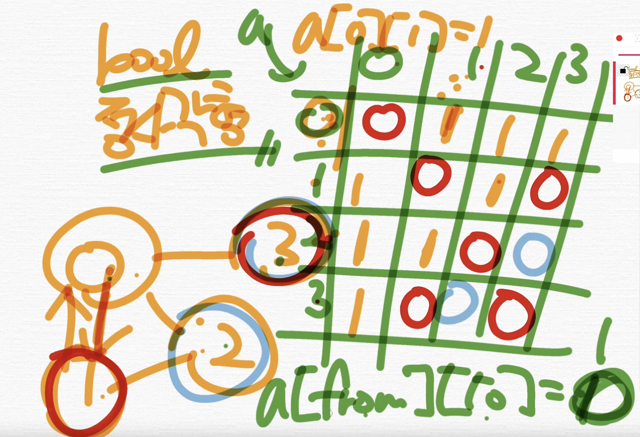 뭐냐면, 이 행렬을 a라고 할 거에요. 만약에 a[from][to] = 1이면, from 정점에서 to 라는 정점까지 가는 간선이 있다라고 할 거에요. 만약에 그러한 간선이 없으면 0이라고 할 겁니다.