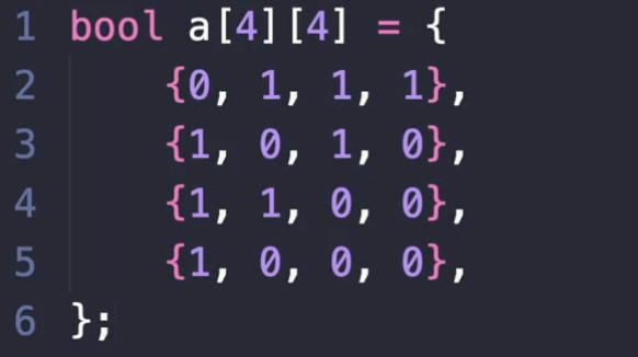 인접행렬이라는 것은 그래프에서 정점과 간선의 관계를 나타내는 bool 타입의 정사각형 행렬이에요.