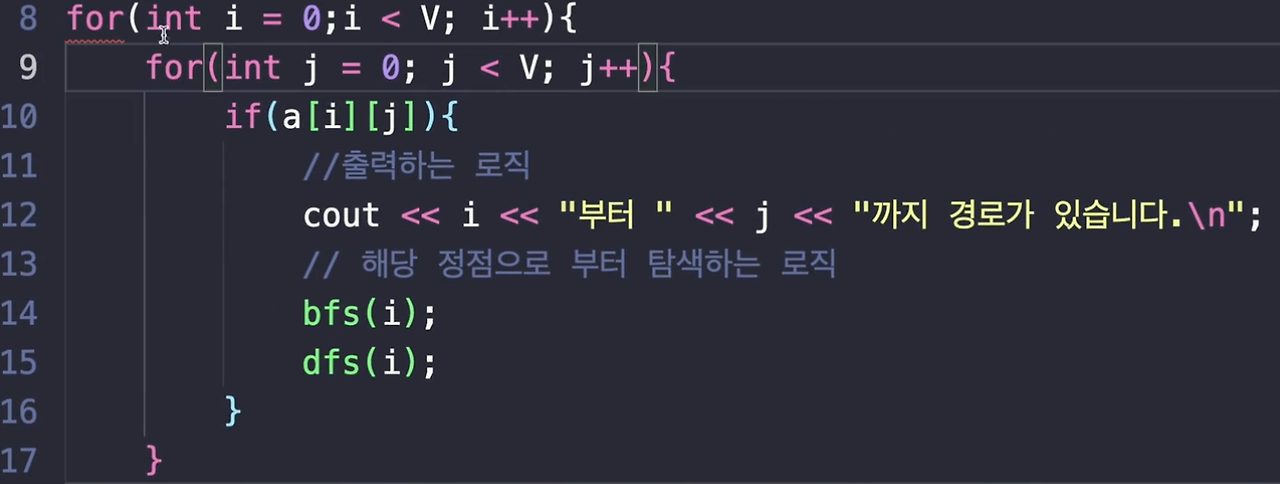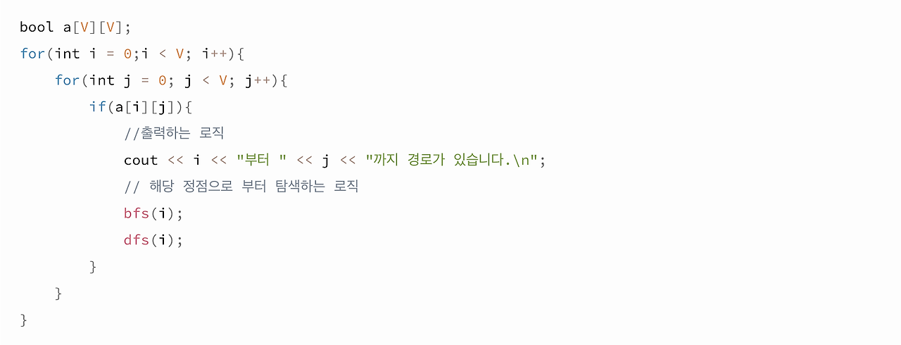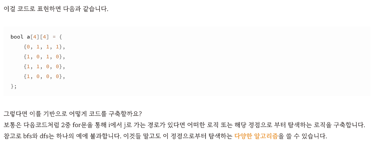 이렇게 쓰여요. 이렇게 y를 중심으로 탐색하면서 만약에 i로부터 j까지의 간선이 있다고 하면 그 i라는 정점부터 bfs, dfs 이런 식으로 쓰인다는 거예요.