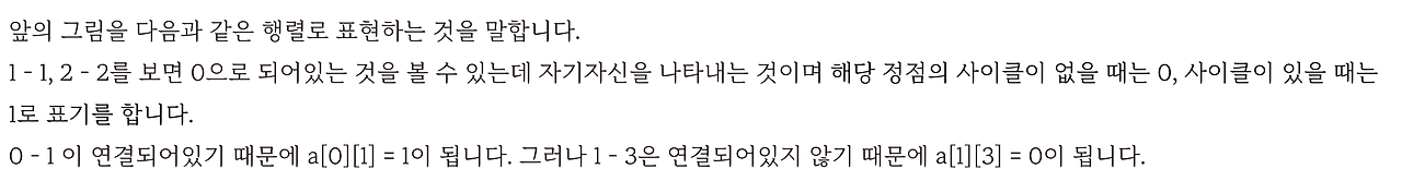 예를 들어서 이런 식의 자기 자신을 도는 사이클을 가진 그래프가 있어요. 이거 같은 경우는 중양열에서 [1][1] 부분이 1이 되는 거예요. 근데 이런 사이클이 이 그래프 내에서는 없죠.