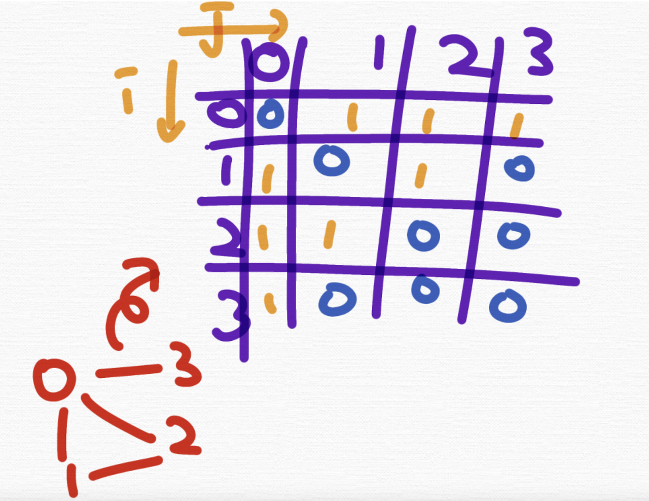다시 정리하자면, from 이라는 정점에서 to 라는 정점까지 연결되어 있으면 1이구요. 연결되어있지 않으면 0인거에요. 이게 바로 인접행렬 이라는 거에요.