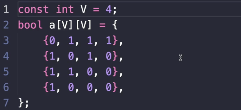 이렇게 연결되어 있었죠? 이거를 인접행렬로 나타낼 건데 인접행렬, bool 타입의 정사각형 행렬을 만들 거예요.