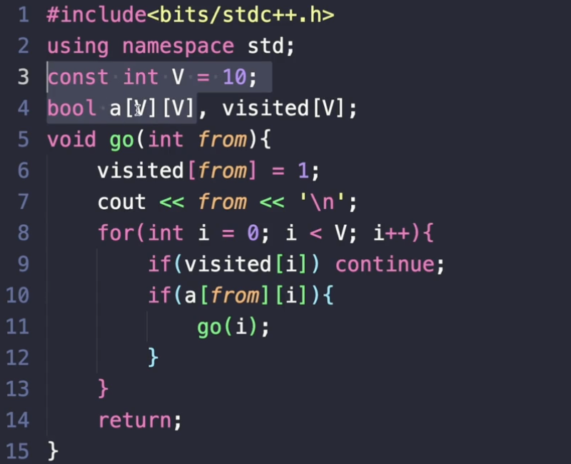 그래서 visited 라는 배열이 필요하다는 거고, 이제 go 라는 함수를 볼게요.