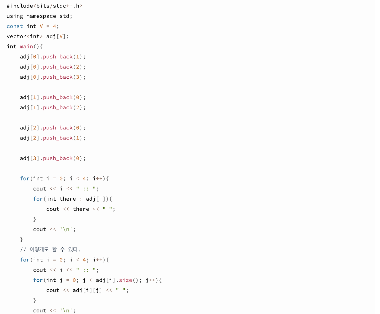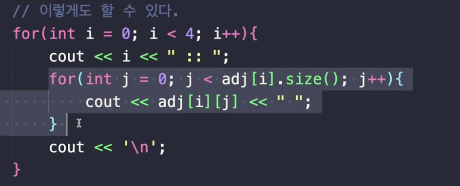 몇 번 정점에 연결된 것들을 이런 식으로 순회를 해서 연결된 정점을 뽑아내실 수가 있는 거에요. 지금 이거는 C++에서 제공하는 범위기반 for문인데