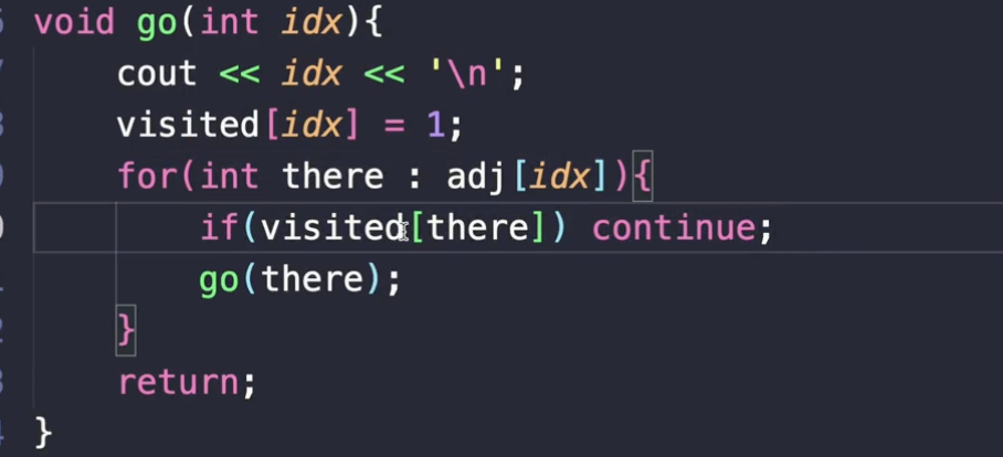 go 함수 안에는 출력하는 로직이 들어있죠. 그리고 순회하면서 만약에 연결되어 있는 정점이 이전에 방문 되었다면 continue 하고, 아니라면 go를 다시 들어가죠.