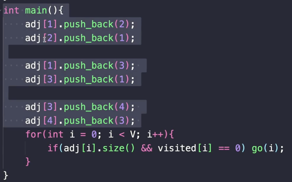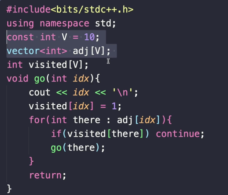 이렇게 push_back을 해서 인접 리스트를 만들었어요. if 문을 보면, 만약에 연결되어 있는 정점이 있고, 해당 정점을 방문하지 않았다면 go 라는 재귀함수가 작동이 됩니다.