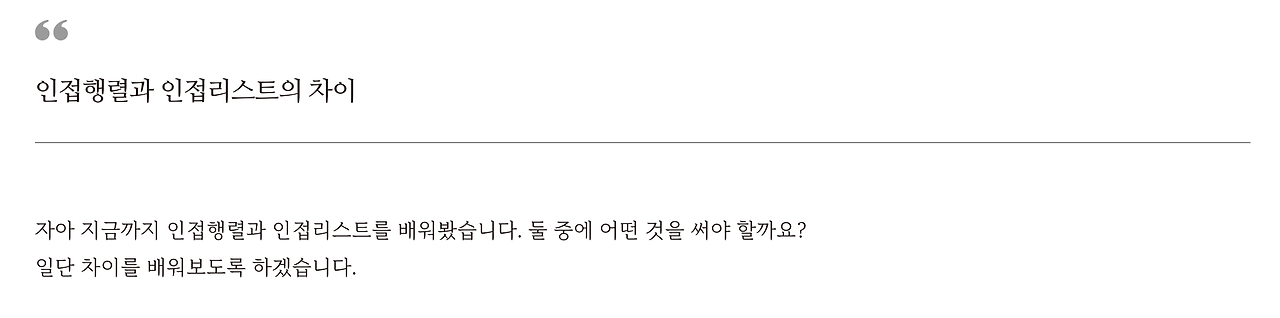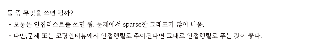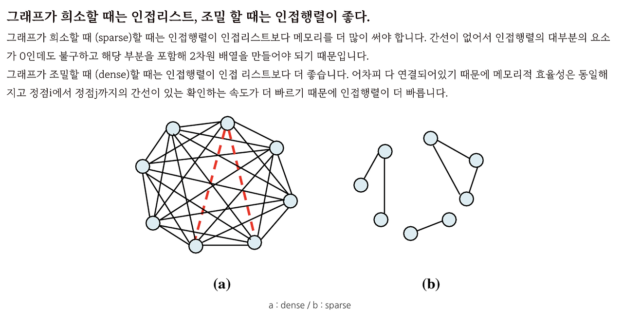 또 하나가 있는데, 그래프가 희소할 때는 인접 리스트가 좋고, 그래프가 조밀할 때는 인접 행렬이 좋아요.