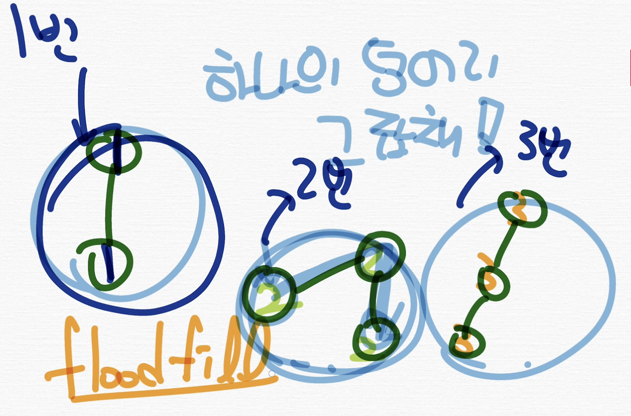 이 컴포넌트에 들어가 있는 거를 모두 1번. 이렇게 1, 1 이렇게 색칠하는 거예요. 얘는 2번으로 색칠하고 얘는 3번으로 색칠해서 이렇게 서로 id를 부여하는 것을 flood fill 이라는 알고리즘 라고 합니다.