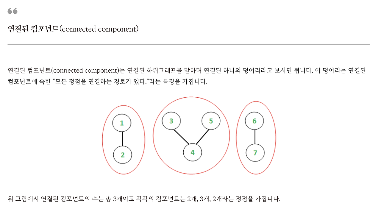연결된 컴포넌트는 연결된 하위 그래프를 얘기를 하고요. 연결된 하나의 덩어리다 라고 보시면 돼요.