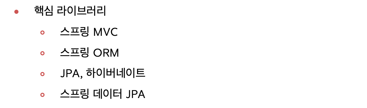 스프링 MVC, 스프링 ORM, JPA, Hibernate, 스프링 데이터 JPA가 있습니다. 물론, 스프링 데이터 JPA는 이번 강의에서 쓰진 않을 겁니다.
