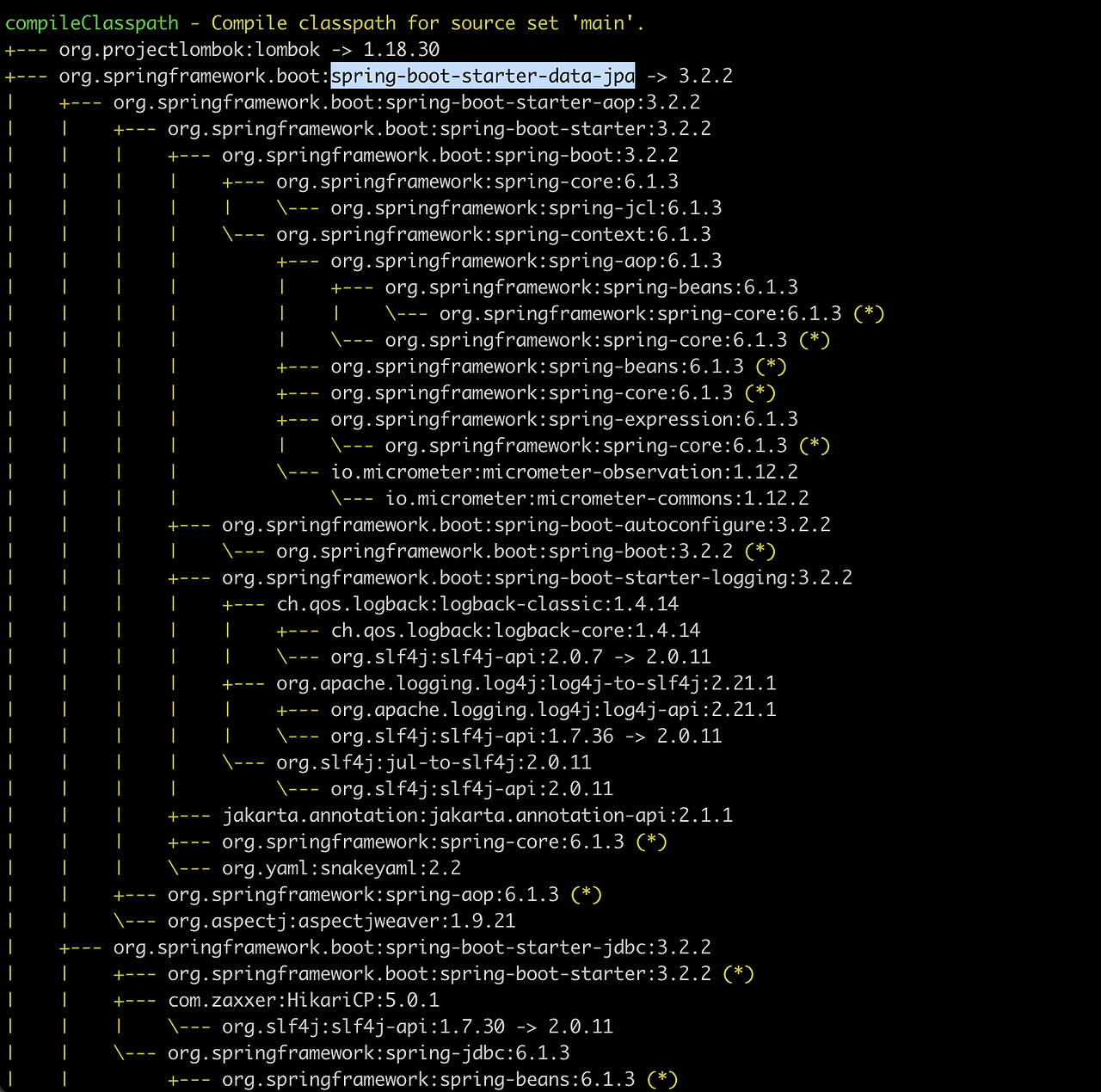 예를 들어서, 'org.springframework.boot:spring-boot-starter-data-jpa' 라는 걸 쓰면, JPA나 Hibernate, 스프링과 관련된 다른 것들을 갖다가 쓰겠죠.