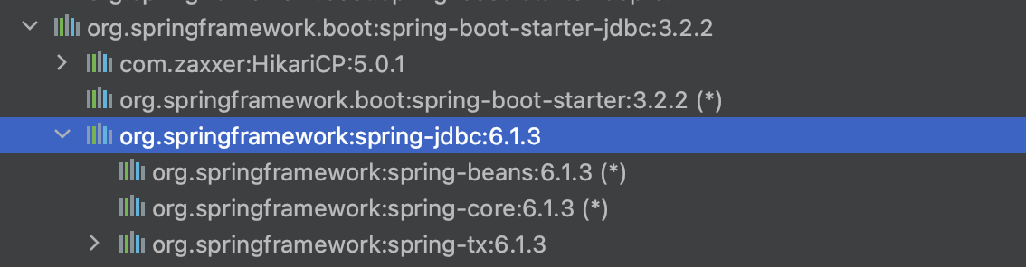 spring-boot-starter-aop는 AOP와 관련된 것들이고, 그 다음에 spring-boot-starter-jdbc는 결국 데이터베이스 커넥션이나 그런 거를 다 갖다 써야 되기 때문에