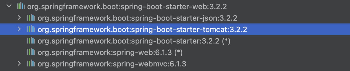 spring-boot-starter-web이 spring-webmvc를 의존하고 있죠. 엄청 중요하겠죠? 이것도 의존하고 있는 걸 확인할 수가 있습니다. 그래서 web만 갖다 쓰면, Tomcat과 Spring Web mvc를 다 쓸 수 있게 되는 이유가 이것 때문에 그런 거고요.