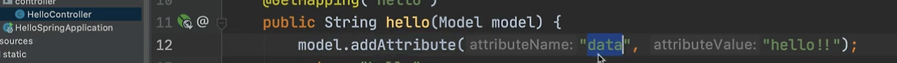 model에다가 addAttribute 해서, 여기다가 data라는 이름의 key에다가 value를 hello!! 라고 넘긴 것이다.