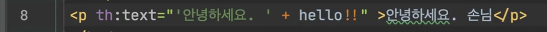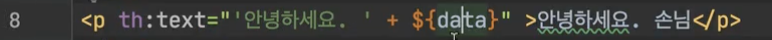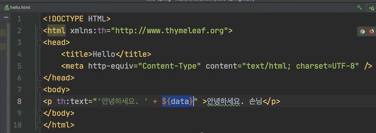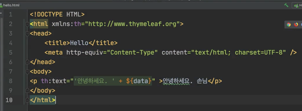 2번째 줄에 타임리프 템플릿 엔진이 선언되어 있다. 2번째 줄을 넣어주면, 이제 템플릿 엔진으로서 타임리프 문법을 쓸 수 있다.