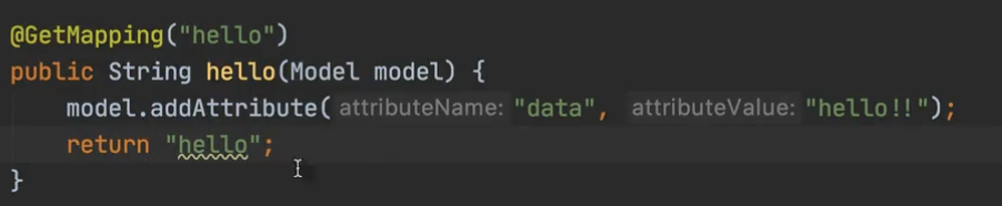 즉, spring이 model 이라는 걸 만들어서 넣어준다. 그런데 이 메서드에서 model에다가 key는 "data"고, value는 "hello!!"를 add 해줬다. 물론, 값을 변경하고 db에 조회해와서 넣을 수도 있다.